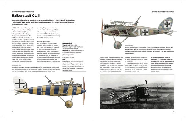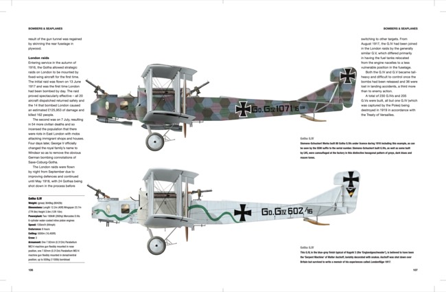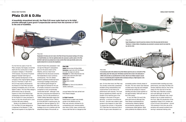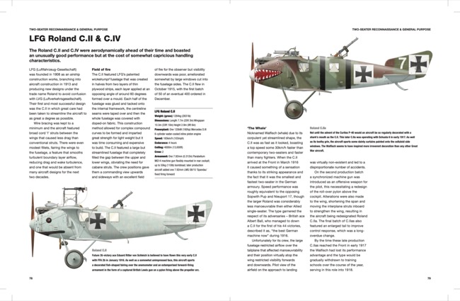 All the major and many minor types are featured, including monoplanes, biplanes, single-seater fighters, two-seater fighters, bombers, ground attack aircraft, night bombers, giant bombers and floatplanes. This includes both well-known and lesser- known models, such as the LVG and Pfalz single-seater fighters, the Gotha and Zeppelin Staaken large bombers, AEG ground attack aircraft, and the Albatross, Halberstadt and Brandenburg two-seater biplanes.