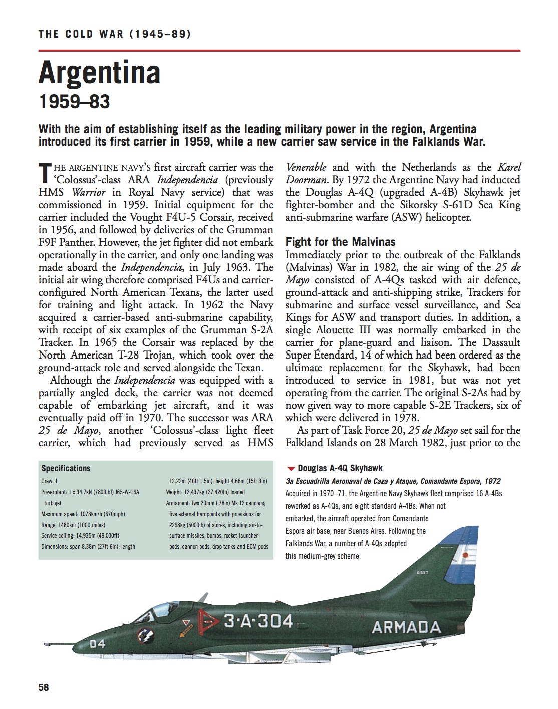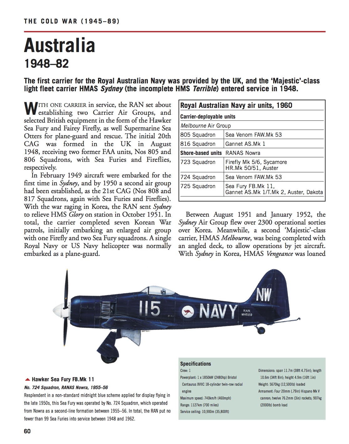 Chapters are divided by nation, profiling the carrier aircraft of the US, the UK, France and Russia, as well as the smaller carrier-capable nations, including Canada and Australia. Tables include full lists of operating units for key aircraft (such as the F-14 Tomcat and Sea Harrier), and each chapter is preceded by details of carrier development, nation-by-nation, with specifications for key carrier designs (USS Nimitz, HMS Ark Royal), carrier profiles where appropriate, as well as tables of typical air wing components through the years, and details of combat operations (Korea, Vietnam, Falklands).